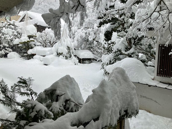 1月22日は一日中雪が降り続き、23日朝の中庭は50cmほどの積雪になっています。