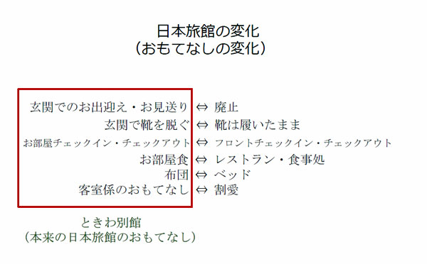 右が今の旅館のトレンド、左が当館のやっていることです。